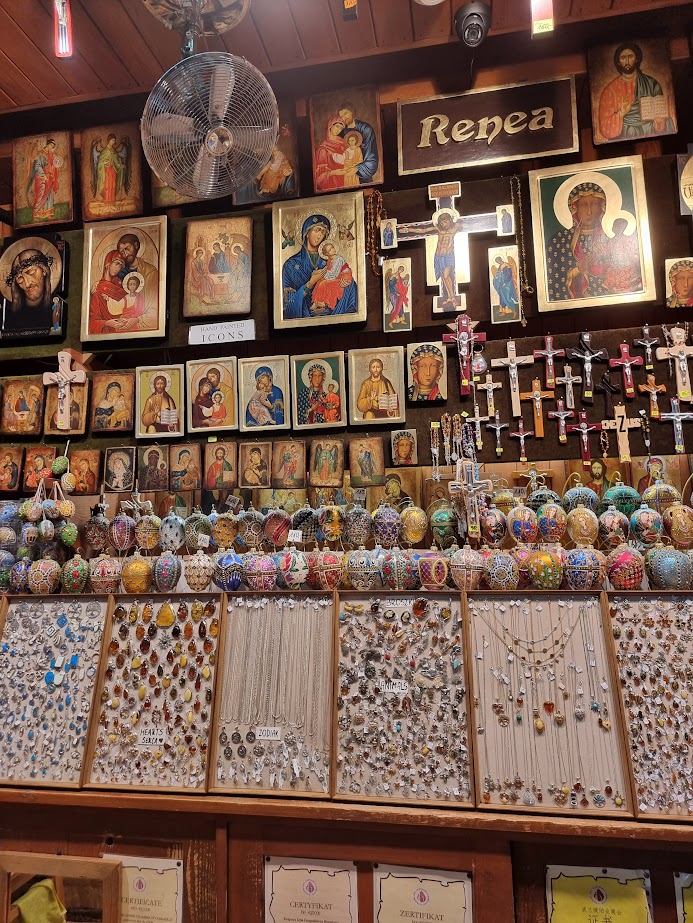 - Objets liés au pape Jean-Paul II : la Pologne célèbre encore la mémoire du Pape polonais Karol Wojtyła, connu sous le nom de Jean-Paul II. Médailles, chapelets en bois d’olivier ou en ambre, et statuettes sont omniprésents. Ne manquez pas non plus de visiter les boutiques des monastères, qui proposent souvent des produits de grande qualité, comme des herbes médicinales, des bougies en cire d’abeille ou du miel local.